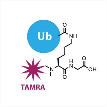 UbiQ-012 (Ub-FP) is a fluorescence polarization assay reagent which is based on a 5-carboxytetramethylrhodamine (TAMRA) modified Lys-Gly sequence that is linked to ubiquitin via a native isopeptide bond with the lysine side-chain. Typical substrate concentrations range from 10−100 nM. DUB concentrations can range from 0.01-10 nM but depend on specific assay conditions and method of detection.