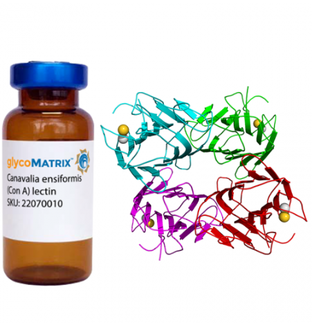 Affinity purified concanavalin A (Con A) is composed of two identical subunits of 237 amino acid residues (MW: 26,000 without any cystine residues). While above pH 7 it is predominantly tetrameric, at pH 4.5 � 5.6, Con A binds two metal ions per monomer: transition metals, Mn2+ and Ca2+. Both ions are required for binding with optimum activity at a pH 7.0. Con A binds with non-reducing ?-D-glucose, ?-D-mannose and ?-methyl-D-glucopyranoside acts as a competitive inhibitor. Con A does not have a blood group specificity. It exhibits mitogenic activity with lymphocytes and cancer cells. While lymphocytes and cancer aggregate by Con A; normal white cells do not. Normal cells react to Con A after proteolytic treatment which suggests that trypsinization causes clustering of the reactive glycan residues on the membrane. Con A interacts with cell types include locust muscle fibers, adipocytes, and rat liver plasma membrane components. This lectin induces endoreduplication in mammalian cells and it reacts with E. coli, Dictyostelium discoideum and Bacillus lipopolysaccharides. Immobilized Con A has been used in affinity chromatography purifications of a wide variety of glycoproteins and cellular structures.
