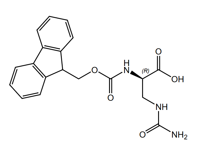 Synonyms: Fmoc-D-Dap(2-Carbamoyl)-OH, Fmoc-D-Ala(Ureido)-OH, N-alpha-(9-Fluorenylmethoxycarbonyl)-N-beta-carbamoyl-D-alpha,beta-diaminopropionic acid, (R)-N-alpha-(9-Fluorenylmethyloxycarbonyl)-N-beta-carbamoyl-2,3-diaminopropionic acid, (R)-2-(((9H-fluoren-9-yl)methoxy)carbonylamino)-3-ureidopropanoic acid