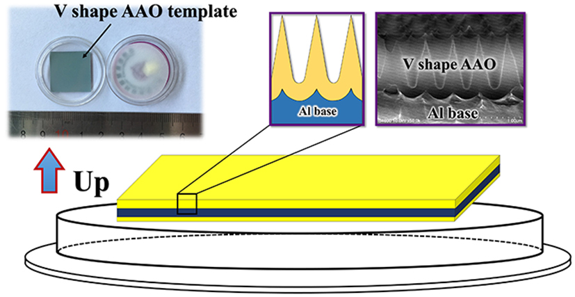 For more applications of V-shape AAO, please refer to: Adv. Mater. 2014, 26, 2805;ACS Nano, 2015, 9, 10287;Adv. Funct. Mater. 2017, 27, 1604720;Nanoscale Research Letters 2013, 8,268;J. Phys. Chem. C 2017, 121, 9757; Nano Energy, 2016, 22, 539; ACS Nano 2017, 11, 5113.