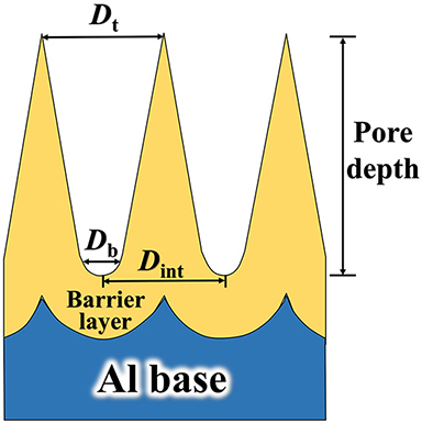 Figure 1. Schematic of V-shape AAO product. Dint is the interpore distance,Dt is the diameter on the top surface and Db is the diameter at bottom.