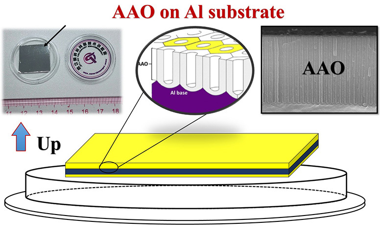The pore diameter can range from 10 nm to several hundred nanometers, and the depth (or thickness of AAO) can be controlled continuously from several ten nanometers, up to one hundred microns. The pores of AAO on Al substrate is short-range ordered over a large area, which can be used as a master to transfer porous structures into other materials. The high density and high aspect ratio structure, provides a 3D nanostructure with a large surface-to-volume ratio, leading to high affinity of organic molecules. It has great potential in optical detection application. In addition, AAO on Al substrate can be used as a mask to electrically deposit nanowire with AC current.