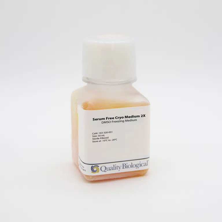 QBI’s Serum Free Cryo Medium is a sterile, 2X concentrated cell freezing medium containing DMSO developed for the cryopreservation of cells grown under serum-free conditions. Serum Free Cryo Medium is an animal-free, protein-free, chemically defined medium containing DMSO and other cryoprotective components. The 2X concentrated formulation allows for dilution with either conditioned medium or complete fresh medium. The Serum Free Cryo medium does not contain phenol red.