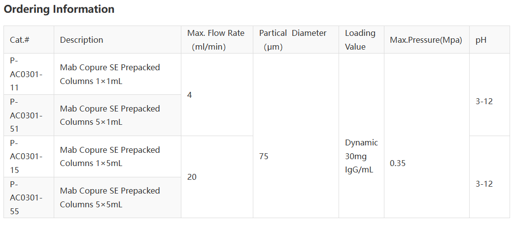 Prepacked Mab Copure SE media is a medium used to capture monoclonal antibodies from samples. Ideal for purification of Mab from high-level expression feedstocks with increased media loading.