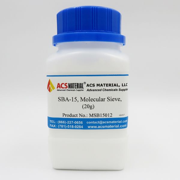 Mesoporous silica SBA-15 is synthesized in acidic conditions using triblock copolymer Pluronic 123 (EO20PO70EO20) as a pattern and tetraethoxysilane (TEOS) for the source of silica. Once synthesis is complete, the organic template is removed by a variety of methods, including calcination; reflux extraction; H2O2 treatments; microwave digestion; and/or washing with pure solvents, ethanol, acetone, or water. ACS Materials’ SBA-15 was calcined in air at 823 Kelvin for 6 hours, resulting in a fine, white powder.