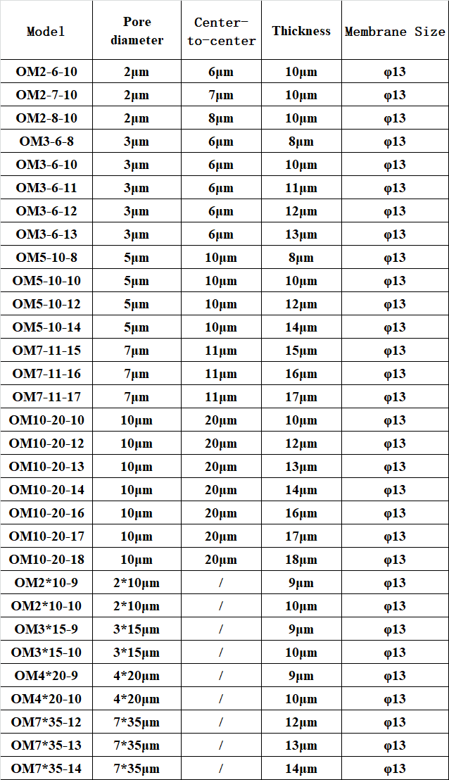 *The above are micropore membranes with pore diameter of 2, 3, 5, 7, 10 μm. If you need customization, please contact our customer service.