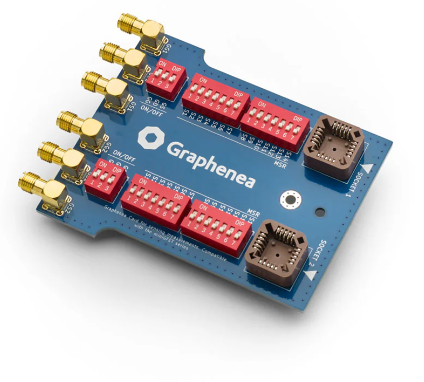 The Graphenea Card interfaces the graphene microdevice and the electrical equipment used for its readout. This card is a printed circuit board (PCB) with a socket into which insert a leadless chip carrier (LCC), connected to a series of switches that link to the input/output BNC connectors. These structures are duplicated, allowing for parallel or multiplexed testing. The PCB is fully compatible with the mGFET 4x4 series. It The individual source switches allow to choose an individual channel or to