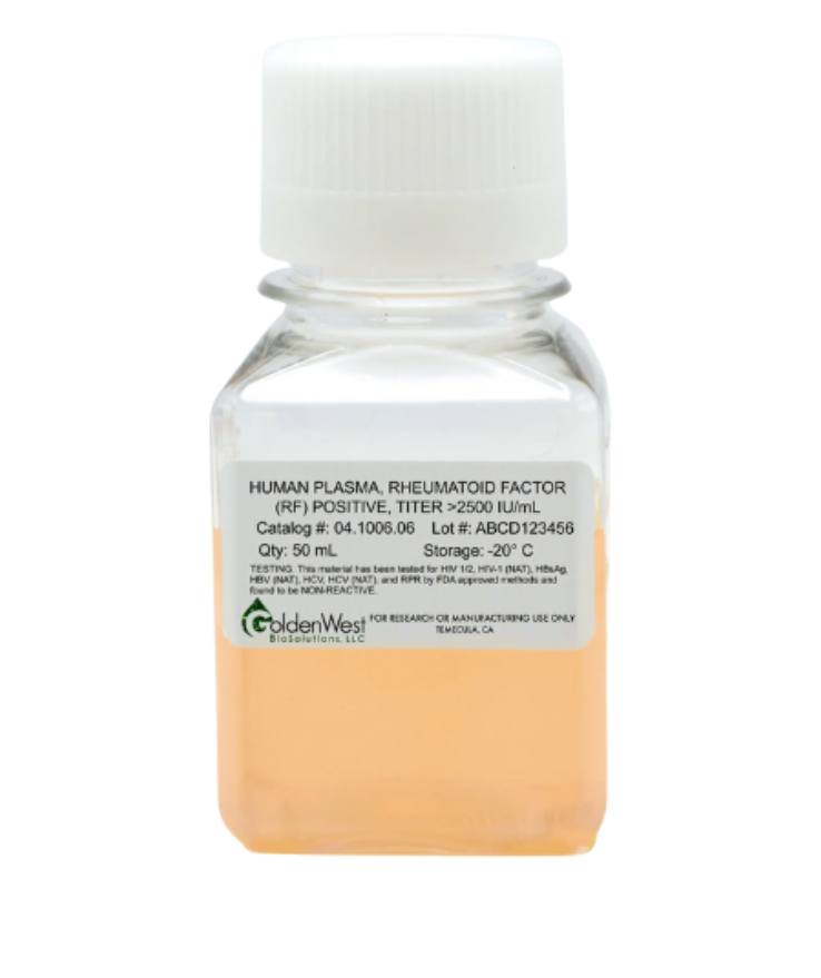 Enhance your autoimmune diagnostic and research workflows with human plasma confirmed RF-positive at ultra-high titers exceeding 2500 IU/mL (Cat# 04.1006). Derived from donors with substantial RF elevation, this disease-state plasma offers exceptional sensitivity and reliability for demanding immunoassay development, quality control calibration, and advanced biomarker investigations.